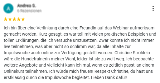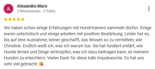 Ich weiß endlich auf was ich in welchem Moment achten muss und habe so viele tolle Tipps bekommen, die Alternativen zu bestimmten Verhaltensweisen bieten. Ich weiß nun, wo ich ansetzen kann, um das mich störende Verhalten anzupacken! Danke dafür! Die tolle „Bibliothek“ ist dabei nur das i-Tüpfelchen.